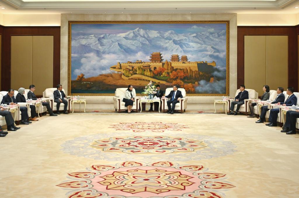 任振鶴對代表團一行表示歡迎,向外交部長期以來為促進甘肅對外開放和交流合作給予的支持表示感謝。他說,習近平主席曾指出,甘肅地域遼闊,自然風光優美,黃土高原、廣袤草原、茫茫戈壁、潔白冰川構成了一幅雄渾壯麗的畫卷,宛如一柄“玉如意”。甘肅是中華文明的一扇窗口、絲綢之路的一顆明珠、資源能源的一座寶庫、科技創新的一片高地、發展產業的一方沃土。當前,甘肅深入貫徹落實習近平主席對甘肅重要講話重要指示批示精神,聚焦經濟建設這一中心工作和高質量發展這一首要任務,完整、準確、全面貫徹新發展理念,在轉方式、調結構、提質量、增效益上持續用力,全省經濟社會發展呈現穩神競進、進中提質、結構改善、勢能俱增的良好態勢,全面建設社會主義現代化幸福美好新甘肅邁出堅實步伐。甘肅高質量發展的道路是一條開放之路、合作之路、共贏之路,我們愿同各國朋友進一步加強交流合作,共沐如意甘肅的大美風光,共享交響絲路的無限商機,共同書寫甘肅與世界聯通、相通、融通的新篇章。